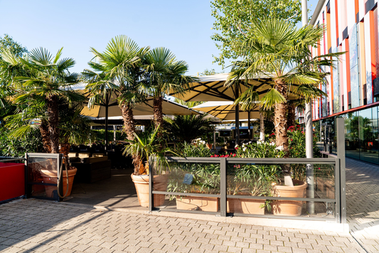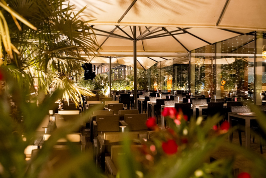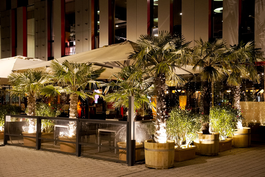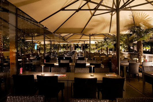 In den Sommermonaten kommt auf den großzügigen Außenterrasse mit Lounge-Areas eine garantierte Urlaubsstimmung unter Palmen auf. Eine große Cocktailauswahl rundet das Angebot ab.